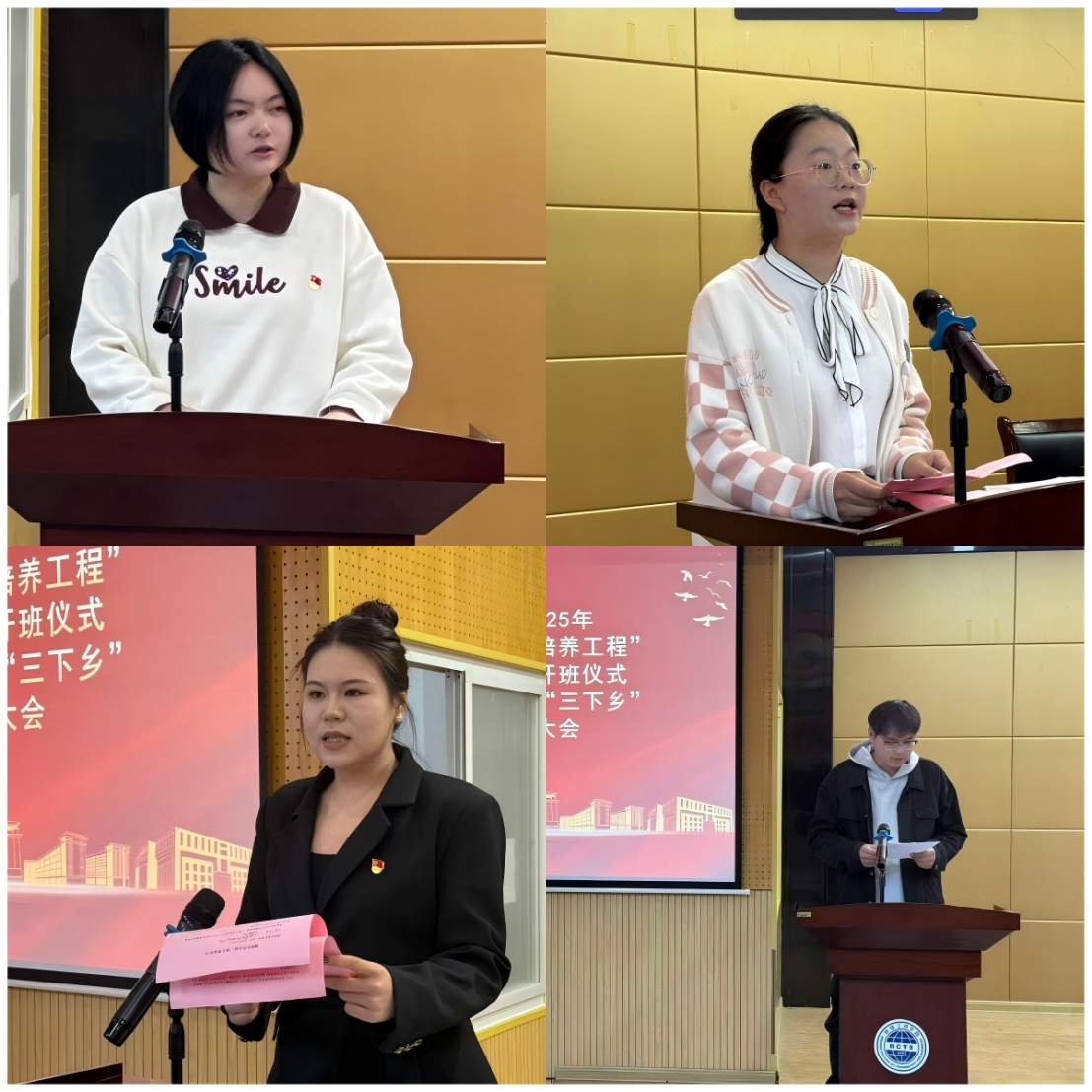 暑期“三下乡”优秀学生代表梁紫薇、2024年“青马班”优秀学员代表赵维玲、2025年“青马班”新学员代表茆天奇三位同学分别结合社会实践、“青马工程”培训参训经历作经验分享和表态发言。社会实践优秀组织奖获奖代表国际商务学院团委书记程露,结合本院近年来社会实践经验,分享了学院组织、指导学生开展社会实践活动的有效做法和宝贵经验,为未来工作提供了有益借鉴。