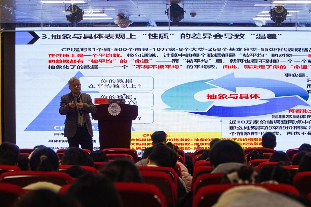关于“为什么”,谢教授以CPI编制方法为例,详细阐释其通过“定人、定点、定时”与“直接调查”相结合的方式,从全国近10万家调查网点、8大类、268个基本分类、550种代表规格品中采集数据,并经加权平均得出结果。他进一步归纳三大成因:一是统计“量”的差异,宏观数据覆盖全社会,个体仅感知有限商品;二是“抽样误差”客观存在,样本难以完全代表总体;三是“抽象平均”与“具体感受”的本质区别。谢教授生动比喻:只要“被平均”,就存在“温差”。高于平均者感觉尚可,低于平均者则易生困惑。他强调,“温差”是客观常态,具有普遍性。