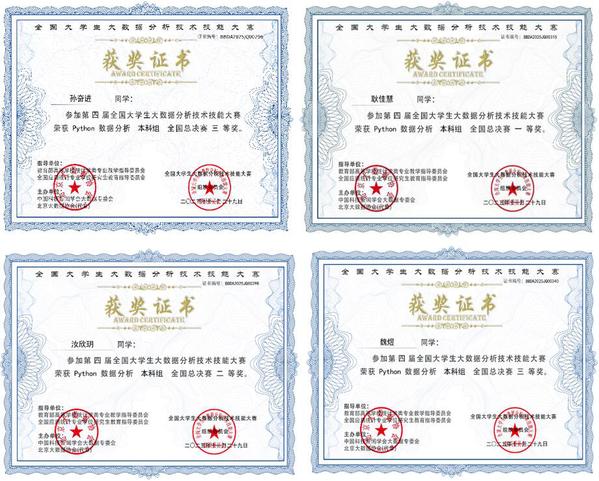 2025年11月22日,第四届全国大学生大数据分析技术技能大赛圆满落幕。我校学子23数据2班耿佳慧荣获Python数据分析全国一等奖,汝欣玥荣获Python数据分析全国二等奖;23数据1班魏煜和23数据2班孙奋进分别荣获Python数据分析全国三等奖。他们凭借扎实的专业知识和技能,充分展现了新时代大学生的创新精神与实践能力。